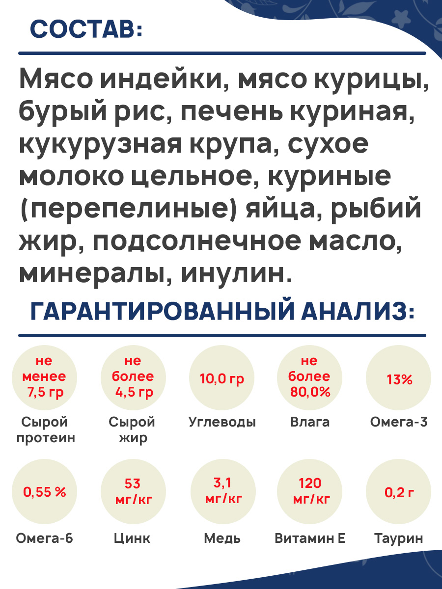 Состав: мясо индейки, мясо курицы, бурый рис, печень куриная, кукурузная крупа, сухое молоко цельное, куриные (перепелиные) яйца, рыбий жир, подсолнечное масло, минералы, инулин.