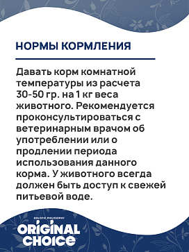 Давать корм комнатной температуры из расчета 30-50 гр. на 1 кг веса животного. Рекомендуется проконсультироваться с ветеринарным врачом об употреблении или о продлении периода использования данного корма. У животного всегда должен быть доступ к свежей питьевой воде.