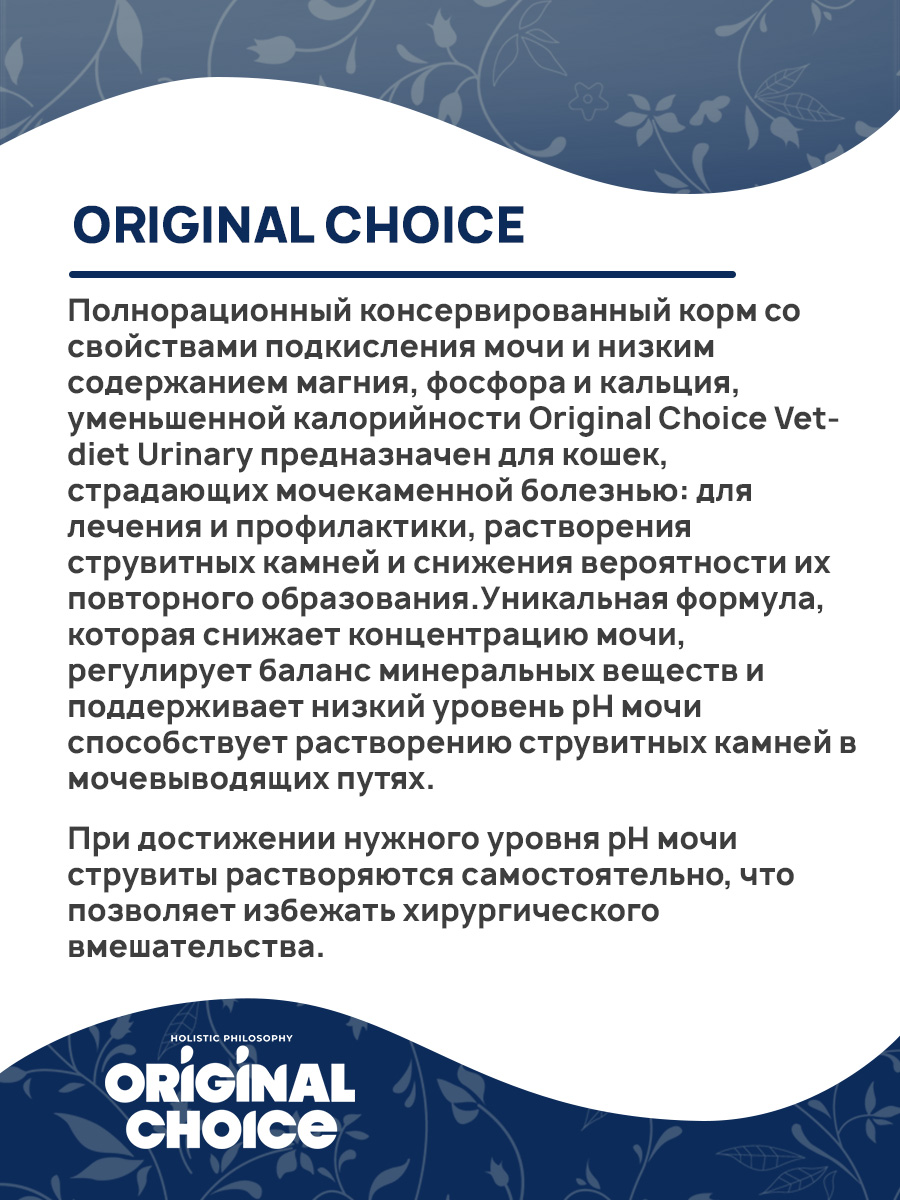 Полнорационный консервированный корм со свойствами подкисления мочи и низким содержанием магния, фосфора и кальция, уменьшенной калорийности Original Choice Vetdiet Urinary предназначен для кошек, страдающих мочекаменной болезнью: для лечения и профилактики, растворения струвитных камней и снижения вероятности их повторного образования.