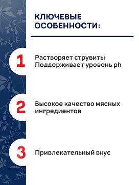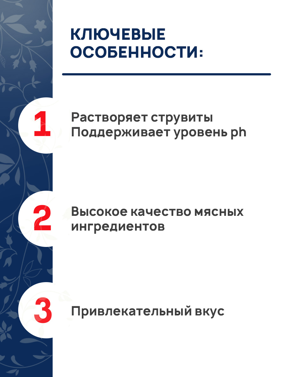 Уникальная формула, которая снижает концентрацию мочи, регулирует баланс минеральных веществ и поддерживает низкий уровень pH мочи способствует растворению струвитных камней в мочевыводящих путях.