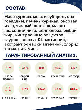 Мясо курицы, мясо и субпродукты говядины, печень куриная, рисовая мука, яичный порошок, масло подсолнечника, целлюлоза, рыбий жир, минеральные вещества, таурин, клюква, DL- метионин, экстракт ромашки аптечной, хлорид калия, витамины.