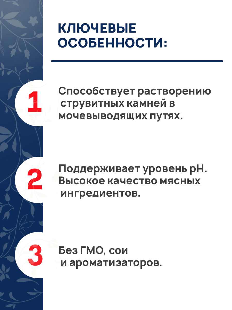 - Способствует растворению струвитных камней в мочевыводящих путях.