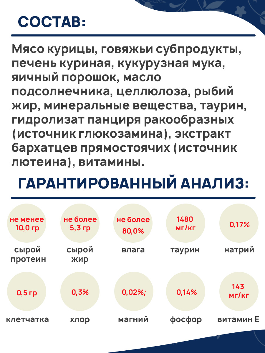 Состав: мясо курицы, говяжьи субпродукты, печень куриная, кукурузная мука, яичный порошок, масло подсолнечника, целлюлоза, рыбий жир, минеральные вещества, таурин, гидролизат панциря ракообразных (источник глюкозамина), экстракт бархатцев прямостоячих (источник лютеина), витамины.