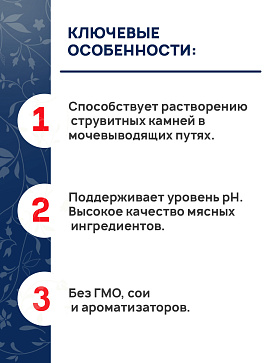Полнорационный консервированный корм для взрослых кошек, страдающих мочекаменной болезнью: для лечения и профилактики, растворения струвитных камней и снижения вероятности их повторного образования.
