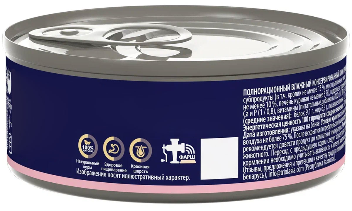 Мясо и субпродукты (в т.ч. кролик не менее 15 %, курица не менее 10 %, сердца куриные не менее 10 %, коллагеновая эмульсия не менее 10 %, печень куриная не менее 5 %), гидролизат куриного белка, клетчатка, витамины группы B, РР, K, Na, Mg, Fe, Cu, I, Se, Са и Р (1 / 0,8).