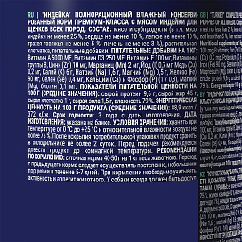 Мясо и субпродукты (в т.ч. мясо индейки не менее 25 %, сердце не менее 10 %, легкое не менее 10 %, трахея говяжья не менее 5 %, печень не менее 3 %), растительная клетчатка, минералы.