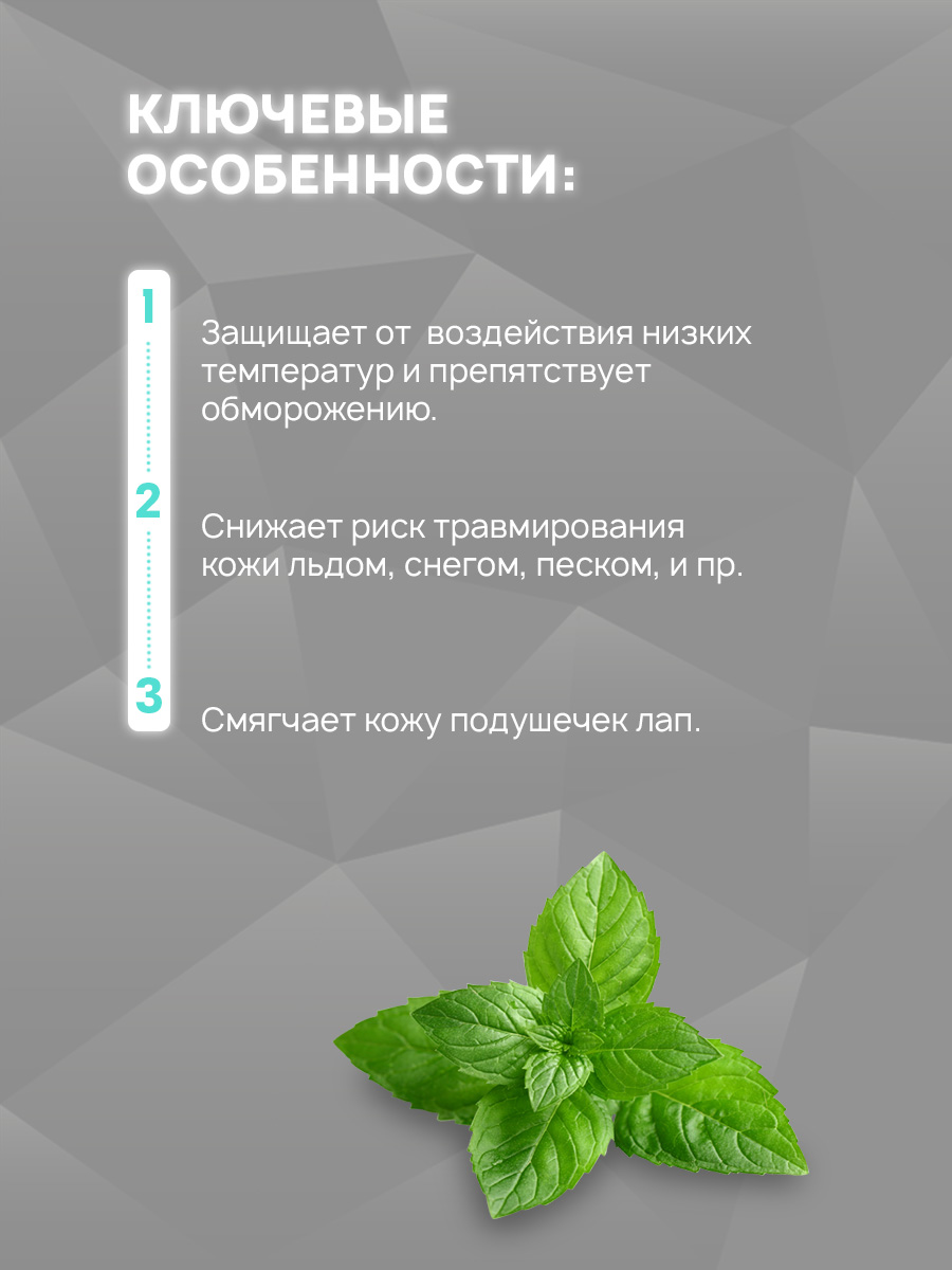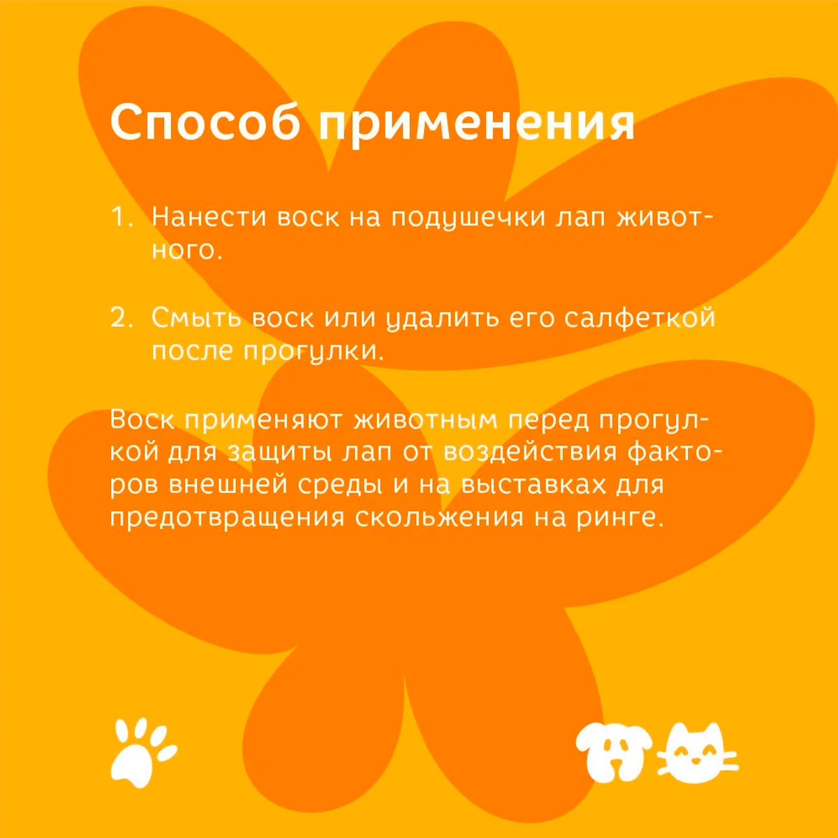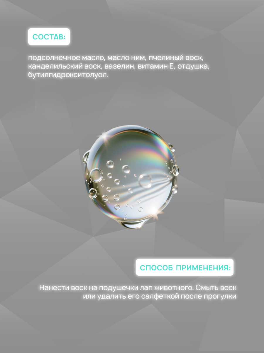 Воск предназначен для ухода за лапами питомца во время прогулки в неблагоприятных погодных условиях.