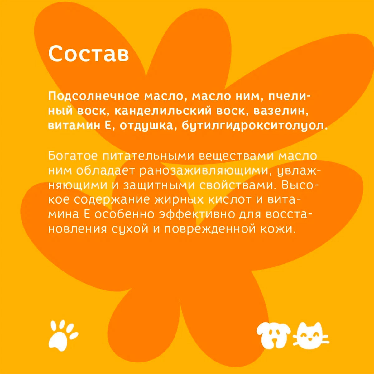Состав: подсолнечное масло, масло ним, пчелиный воск, канделильский воск, вазелин, витамин Е, отдушка, бутилгидрокситолуол.