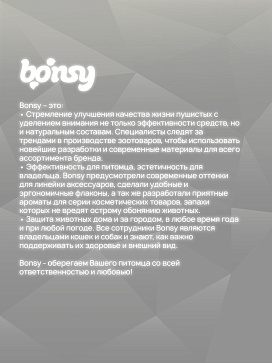 Воск для лап Bonsy образует на поверхности кожи толстую водонепроницаемую пленку, защищающую кожу лап от воздействия противогололедных реагентов, бензина, мазута.