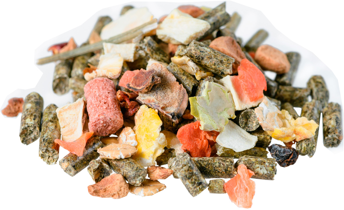 Состав: гранулы из луговых трав, семена злаковых и бобовых растений (в том числе пшеница, ячмень, овес, горох, кукуруза) в натуральном и плющеном виде, сухие овощи, корнеплоды и фрукты (в том числе сушеные морковь, свекла, яблоки, сладкий перец), сушеный укроп, гранулы, содержащие семена злаковых культур, травяную муку с добавлением минеральных веществ, витаминов, пробиотика, пребиотика и энтеросорбента.