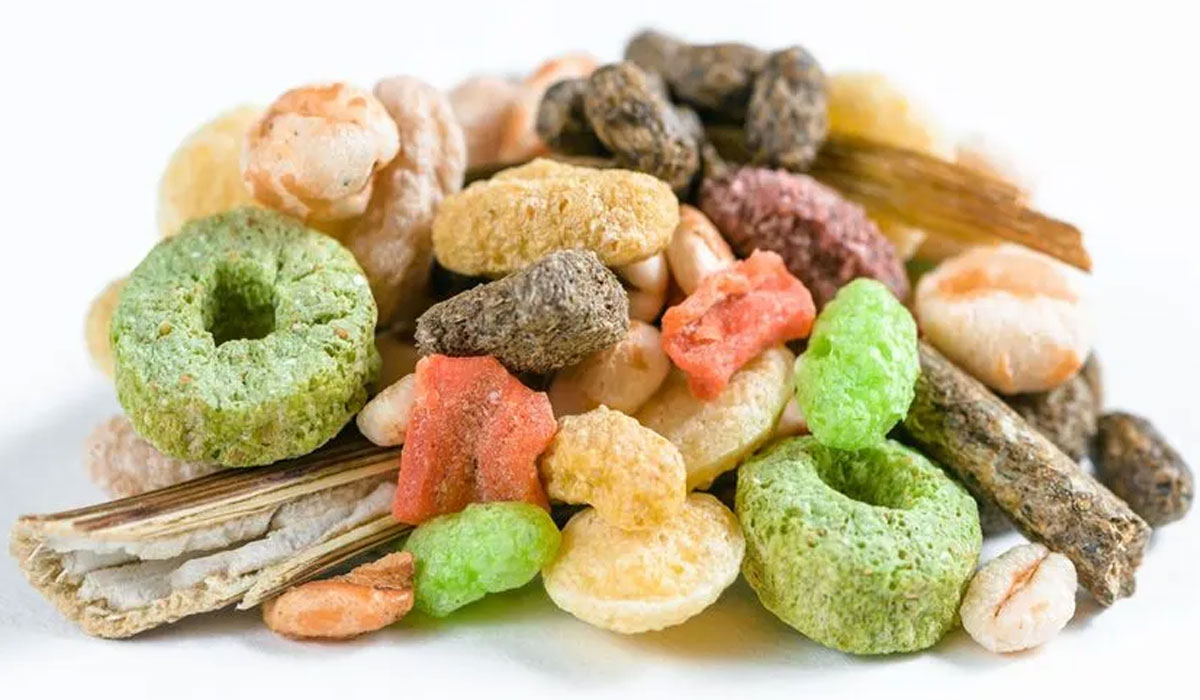 Состав: зерна пшеницы, ячменя, риса, обработанные по специальной технологии, гранулы из луговых трав, зерновые экструдированные гранулы, содержащие минеральные вещества, витамины и пивные дрожжи (самый богатый природный источник витаминов группы В); кукурузные хлопья, сушеные овощи и травы, плоды рожкового дерева.