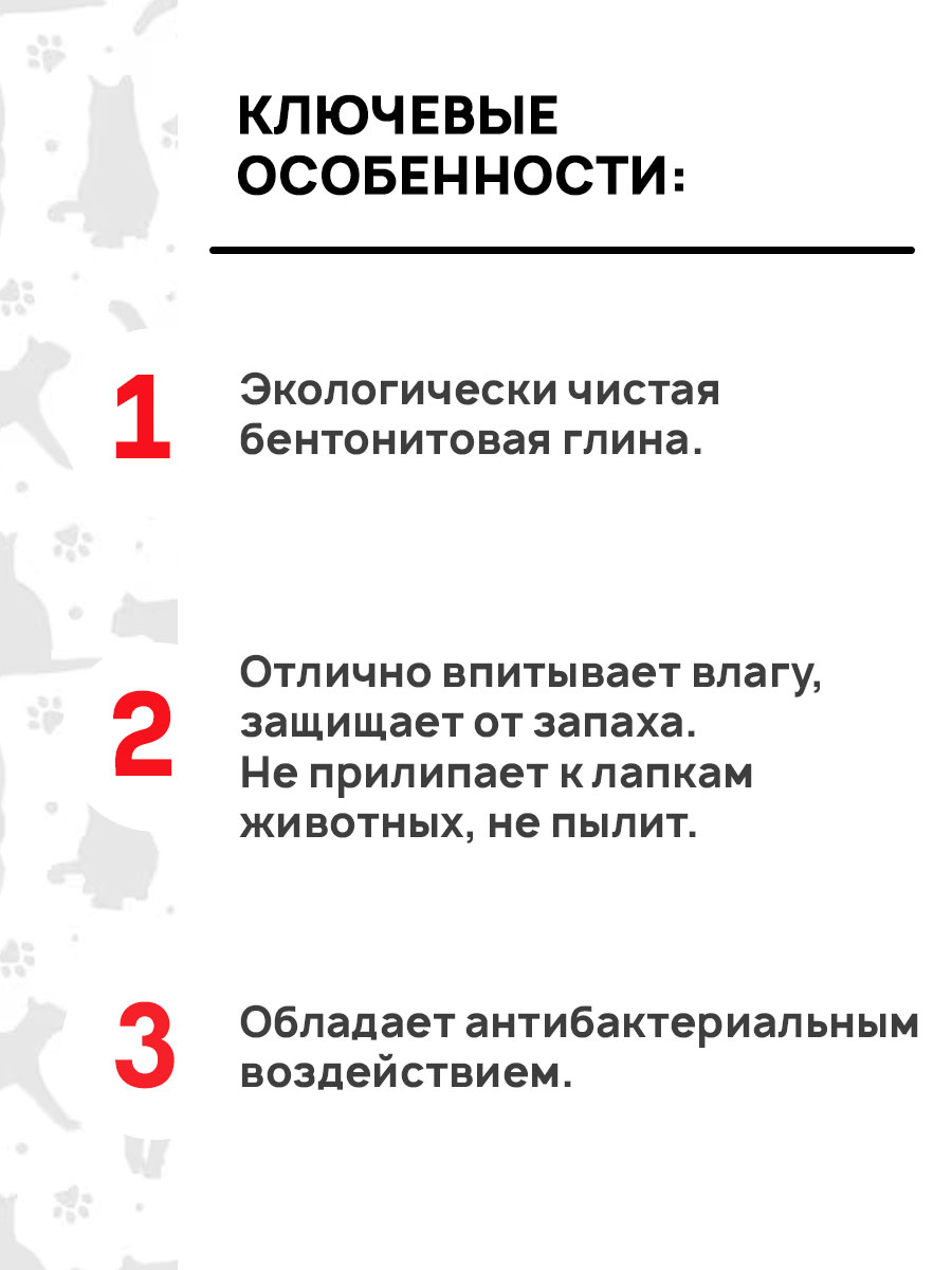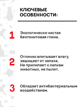 Бентонит является сильнейшим природным сорбентом, интенсивно поглощает запах и обладает антибактериальным воздействием. Размер гранул позволяет обеспечить поверхностное впитывание и формирование комочка, который легко удаляется, не прилипая ко дну лотка. Наполнитель не пылит и не прилипает к лапкам.