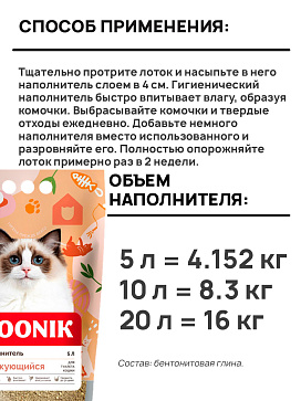 Гигроскопический продукт эффективно впитывает влагу, не позволяя ей дойти до дна лотка, что предотвращает образование микробов и характерных неприятных запахов. В отличие от других подобных материалов не пылит и не измельчается в процессе фасовки, транспортировки и использования.